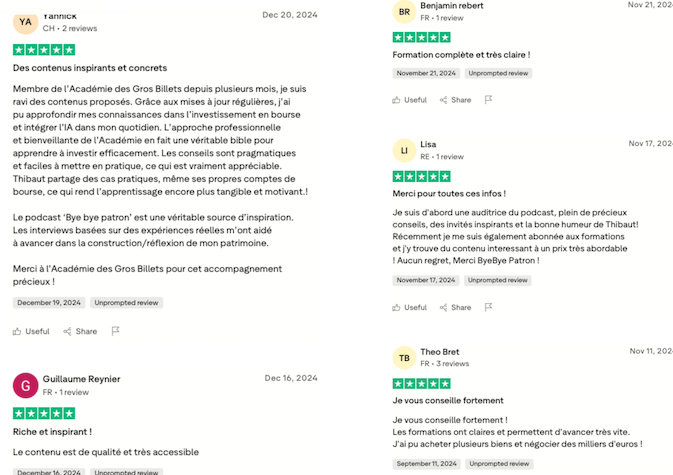Offre lancement Académie Classique — 12 mois 997€ 497€ Facturation une fois • ≈ 41€/mois Dernier lancement à ce tarif. ✔ Accès complet à toutes les formations (Immo, Bourse, IA, Crypto…) ✔ Plan de décollage (Bourse 60 min, Négo, IA) ✔ Communauté WhatsApp + live mensuel ✔ Templates : offres d’achat, mails de négo, dossier bancaire ✔ Bonus : Audit stratégique (20 premiers) ✔ Garantie “Premier résultat ou prolongation 6 mois” Valeur contenu Formations principales997€ Templates & outils197€ Communauté + lives (12 mois)240€ Bonus Podcast + RP gratuite298€ Audit stratégique (50 premiers)197€ Valeur ≈ 2 300€ → 497€ aujourd’hui Garantie 14 jours + prolongation 6 mois si aucun premier résultat.